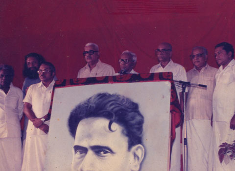 എ കെ ജി, ഇ എം എസ്, എസ് ആർ പി എന്നിവർക്കൊപ്പം പൊതുയോഗത്തിൽ