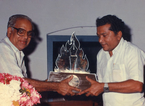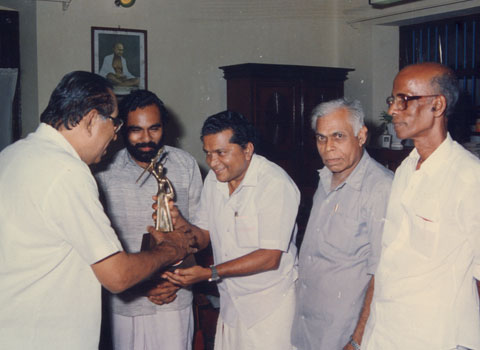 കേരള സാഹിത്യഅക്കാദമി അവാർഡ് - സാംസ്കാരിക വകുപ്പ് മന്ത്രി ടി. കെ. രാമകൃഷ്ണനിൽ നിന്നും സ്വീകരിക്കുന്നു -1990